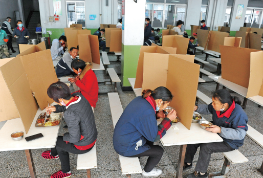 連日來,隨著我市有序推進復工復產,廣大復工企業多措并舉,積極落實新冠肺炎疫情防控措施,為經濟平穩有序發展注入力量。圖為日前,位于徐舍鎮的江蘇利通電子股份有限公司,用一張張硬紙板將職工食堂的餐桌隔離成獨立餐位,讓職工采用隔“窗”用餐的方式防控疫情。